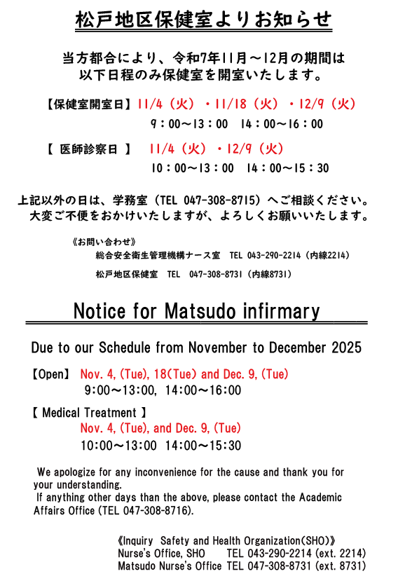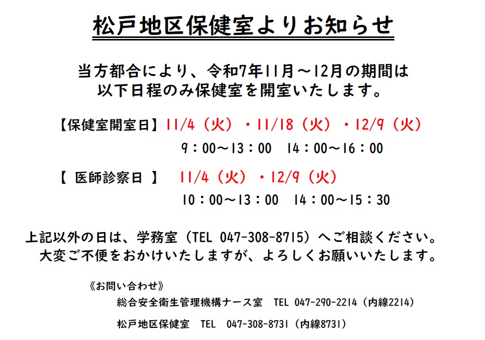 は保健室開室日(9:00〜13:00及び14:00〜16:00 看護師が在室しています)