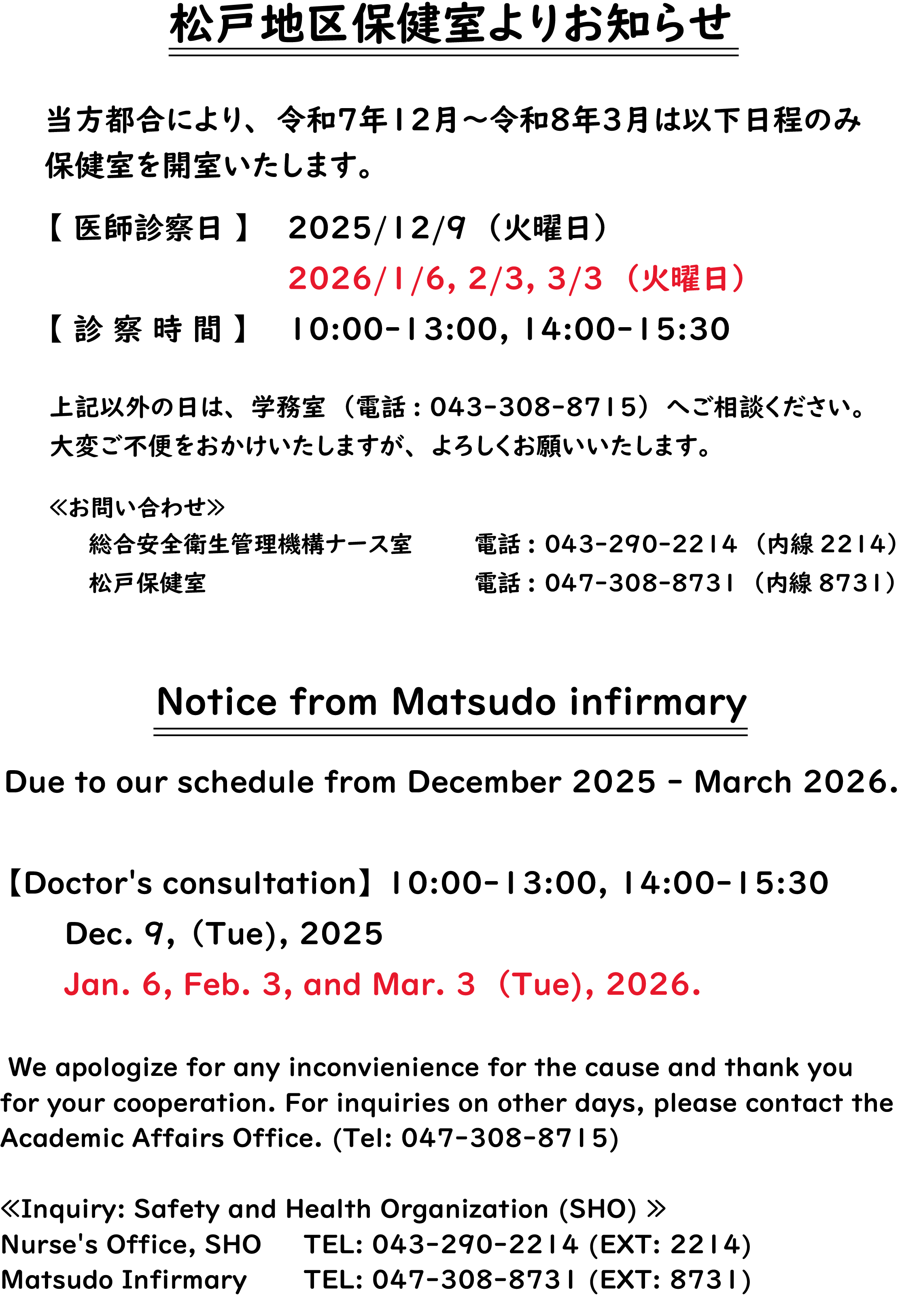 特別健康診断・医師会議の為 診療時間及び担当医が変わることがあります。